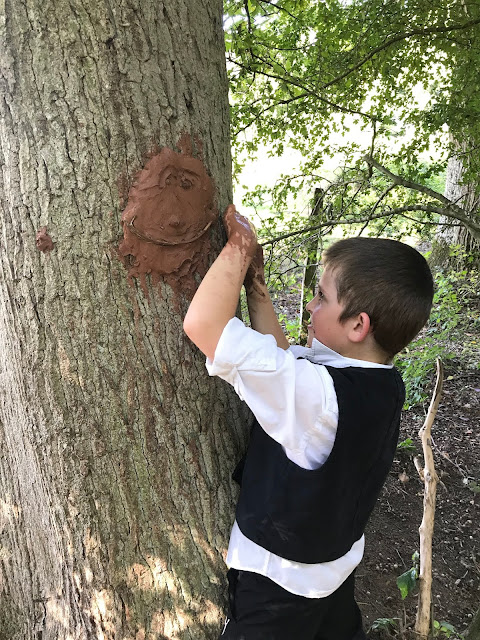 Then we all went down to our little kid's woods with terracotta clay and tools. The kids smooshed it onto the trees and made faces with the tools and natural materials. This is an idea I have borrowed from Camp Mohawk in England (which is amazing by the way).